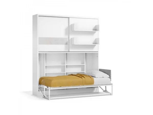 Zeer ruimtebesparend, overdag een kast en ’s avonds tovert men het 1 persoonsbed tevoorschijn. Dit compacte opklapbed klapt naar voren open. Het geheel is gemaakt van 18 mm dik meubelplaat.