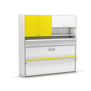 Een opklapbed, 2 meter breed bureau, boekenkast en kasten zijn samen in één eenheid. Je kunt het gebruiken als bed of als bureau. U hoeft geen spullen van uw bureau te halen voordat u uw bed opent of sluit. Speciaal mechanisme houdt het bureau altijd parallel aan de vloer tijdens het openen en sluiten. Zo kunnen al je spullen veilig op het bureau blijven staan.